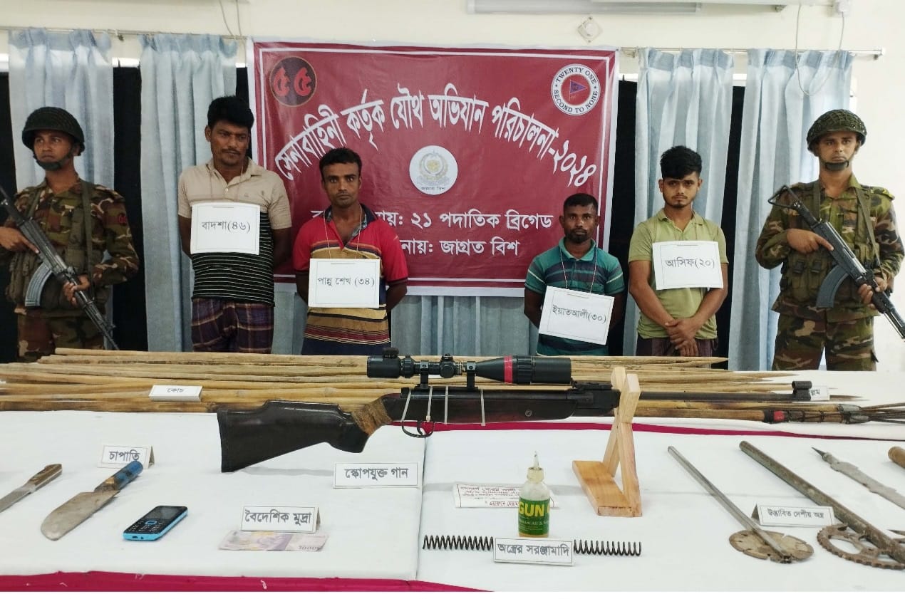 নড়াইলের নড়াগাতী থানার খাসিয়াল গ্রামে আগে থেকে ঘোষণা দিয়ে দুই বংশের সংঘর্ষ চলাকালে একটি আগ্নেয়াস্ত্র ও বিপুল পরিমাণ দেশীয় অস্ত্রসহ চারজনকে আটক করেছে সেনাবাহিনী। গতকাল শনিবার (২৮ সেপ্টেম্বর) সকালে থানার খাশিয়াল গ্রাম থেকে তাদের আটক করা হয়। নড়াগাতী থানার ওসি মো. মোস্তাফিজুর রহমান আটক ও অস্ত্র উদ্ধারের বিষয়টি নিশ্চিত করেছেন। গ্রেফতারকৃতরা হলোন নড়াগাতী থানার খাশিয়াল গ্রামের রমজান শেখের ছেলে আসিফ শেখ (২১), আব্দুস সবুর বিশ্বাসের ছেলে ইয়াত আলী বিশ্বাস(৩২) আবু হানিফ শেখের ছেলে পান্নু শেখ (৩৪) এবং মৃত রউফ জমাদ্দারের ছেলে বাদশা জমাদ্দার(৪৬)। পুলিশ ও স্থানীয় সূত্রে জানা যায়, নড়াগাতী থানার খাশিয়াল ইউনিয়ন ও গ্রামে স্থানীয় আধিপত্য বিস্তারের জেরে শেখ ও মোল্যা বংশের বিরোধ চলে আসছিল। শেখ বংশের নেতৃত্ব দেন চুন্নু শেখ আর মোল্যা বংশের নেতৃত্বে রয়েছেন তবি মোল্যা। শুক্রবার (২৭ সেপ্টেম্বর) রাত ৮ টার দিকে শেখ বংশের মিলন শেখকে খাশিয়াল বাজার থেকে বাড়ি ফেরার পথে দুর্বৃত্তরা এলোপাতাড়ি কুপিয়ে আহত করে। তাকে গোপালগঞ্জ সদর হাসপাতালে প্রাথমিক চিকিৎসা শেষে ঢাকা মেডিকেল কলেজ হাসপাতালে উন্নত চিকিৎসার জন্য প্রেরণ করা হয়েছে। মোল্যা বংশের লোকজনের বিরুদ্ধে মিলন শেখকে কুপিয়ে আহত করার অভিযোগ ওঠেছে । শুক্রবার রাতে দুই গ্রুপের ঘোষণা দিয়ে শনিবার সকালে সংঘর্ষে জড়ানোর সময় নির্ধারণ করে। খবর পেয়ে সেনাবাহিনী ঘটনাস্থলে উপস্থিত হয়। পরে অভিযান চালিয়ে একটি স্কোপ গানসহ বিপুল পরিমাণ রামদা, ছুরি, কুড়াল, দা, ঢাল, বল্লম চাইনিজ কুড়াল, চাপাটি জব্দ করে। অপরদিকে সেনাবাহিনীর সদস্যরা চার জনকে গ্রেফতার করে। নড়াইলের সেনা ক্যাম্পের মেজর আহসান জানিয়েছেন জব্দ করা অস্ত্রসহ আটককৃতদের উপজেলার নড়াগাতী থানায় হস্তান্তর করা হয়েছে।