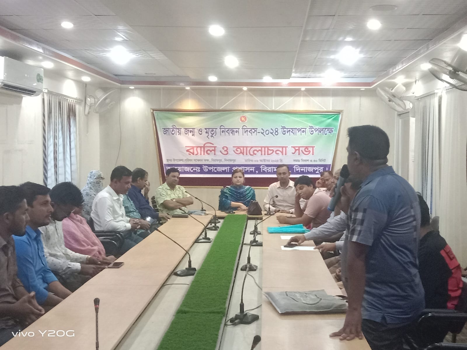 বিরামপুর (দিনাজপুর) প্রতিনিধি :(৬ অক্টোবর) রবিবার বিকাল সাড়ে তিন ঘটিকায় দিনাজপুরের বিরামপুর উপজেলা প্রশাসনের আয়োজনে জাতীয় জন্ম ও মৃত্যু নিবন্ধন দিবস ২০২৪ উদযাপন উপলক্ষে র্যালি ও আলোচনা সভা অনুষ্ঠিত হয়েছে। উপজেলা পরিষদ সম্মেলন কক্ষে উপজেলা নির্বাহী অফিসার নুজহাত তাসনীম আওনের সভাপতিত্বে উপজেলা একাডেমিক সুপারভাইজার আব্দুস সালামের সঞ্চালনায় বক্তব্য রাখেন বিরামপুর পৌরসভার নির্বাহী কর্মকর্তা (ভারপ্রাপ্ত) কামাল হোসেন, উপজেলা প্রাণিসম্পদ কর্মকর্তা ডাঃ বিপুল কুমার চক্রবর্তী, উপজেলা যুব উন্নয়ন কর্মকর্তা এনামুল হক, উপজেলা প্রকৌশলী আতাউর রহমান, উপজেলা শিক্ষা মাধ্যমিক শিক্ষা অফিসার শমসের আলী মন্ডল, উপজেলা সমাজসেবা কর্মকর্তা আব্দুল আউয়াল, উপজেলা প্রাথমিক শিক্ষা অফিসার রুনা লায়লা প্রমুখ । এছাড়াও জাতীয় জন্ম মৃত্যু নিবন্ধন দিবস অনুষ্ঠানে দিওড় ইউনিয়ন পরিষদের সচিব মাসুদ রানা সহ অত্র উপজেলার সকল ইউনিয়ন পরিষদের সচিবগণ এবং পৌরসভার উদ্যোক্তা সহ সকল ইউনিয়ন পরিষদের উদ্যোক্তা গন উপস্থিত ছিলেন।