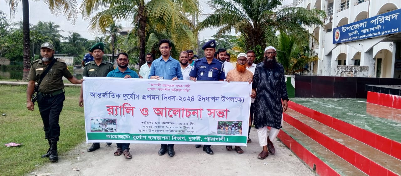 রবিবার (১৩অক্টোবর) সকাল সাড়ে ১০টায় উপজেলা চত্বর থেকে এক বর্ণাঢ্য র্যালি বের করে প্রধান প্রধান সড়ক প্রদক্ষিণ শেষে উপজেলা পরিষদ সভাকক্ষে এসে এক আলোচনা সভা অনুষ্ঠিত হয়। দুমকি উপজেলা নির্বাহী অফিসার মোঃ শাহীন মাহমুদের সভাপতিত্বে, দূর্যোগ ব্যবস্থাপনা কর্মকর্তা মোহাম্মদ আলী'র সঞ্চালনায় অনুষ্ঠিত সভায় উপস্থিত ছিলেন, দুমকি থানার ভারপ্রাপ্ত কর্মকর্তা (ওসি) ফিরোজ আহমেদ, উপজেলা মৎস্য কর্মকর্তা মোঃ সাইফুল ইসলাম, পল্লী সঞ্চয় ব্যাংকের ব্যবস্থাপক মোঃ আল আমিন প্রমুখ।