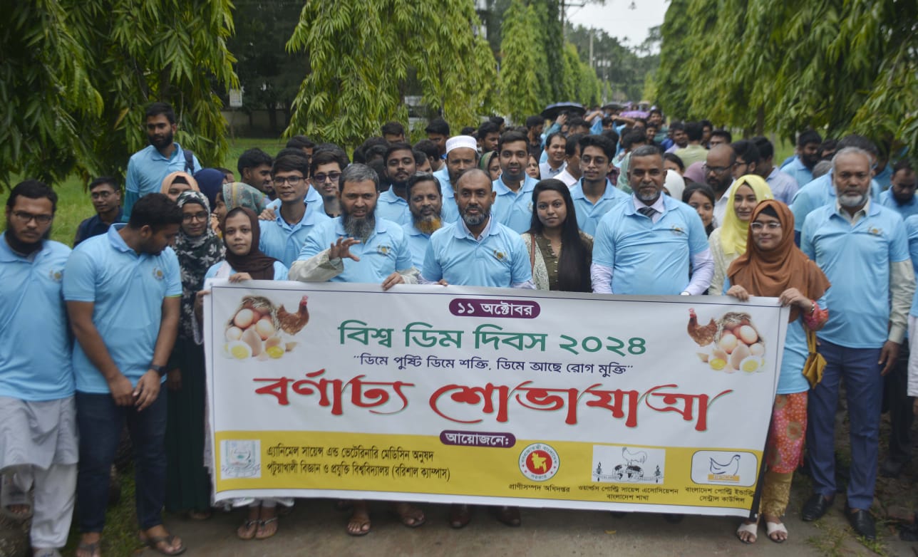 জেলা প্রতিনিধি পটুয়াখালীঃ পটুয়াখালী বিজ্ঞান ও প্রযুক্তি বিশ্ববিদ্যালয়ের (পবিপ্রবি) বহিঃস্থ ক্যাম্পাস বাবুগঞ্জে অবস্থিত এ্যানিমেল সায়েন্স এন্ড ভেটেরিনারি অনুষদে ১১ অক্টোবরের বিশ্ব ডিম দিবস—২০২৪ উপলক্ষ্যে বুধবার (২৩ অক্টোবর) বর্ণাঢ্য শোভাযাত্রা ও আলোচনা সভা অনুষ্ঠিত হয়েছে। “ডিমে পুষ্টি ডিমে শক্তি, ডিমে আছে রোগমুক্তি” এই প্রতিপাদ্যকে সামনে রেখে বিভিন্ন আয়োজনের মধ্য দিয়ে দিবসটি উদ্যাপন করা হয়। উক্ত অনুষ্ঠানে প্রধান অতিথি হিসেবে উপস্থিত ছিলেন ভাইস—চ্যান্সেলর বিশিষ্ট শিক্ষাবিদ ও গবেষক প্রফেসর ড. কাজী রফিকুল ইসলাম। অনুষ্ঠানে বিশেষ অতিথি হিসেবে উপস্থিত ছিলেন বিশ্ববিদ্যালয়ের এলএলএ অনুষদের ডিন প্রফেসর মোঃ আব্দুল লতিফ, রেজিস্ট্রার (অ.দা.) প্রফেসর ড.এস.এম. হেমায়েত জাহান, বিএ অনুষদের সাবেক ডিন প্রফেসর বদিউজ্জামান, সিএসই অনুষদের সাবেক ডিন প্রফেসর মোহাম্মদ জামাল হোসেন, প্রফেসর ড. মোঃ মাহবুব রব্বানী, ছাত্র বিষয়ক উপদেষ্টা প্রফেসর ড. মোঃ জিল্লুর রহমান, এএনএসভিএম অনুষদের সাবেক ডিন প্রফেসর ড. মামুনুর রশীদ, ছাত্র বিষয়ক উপ—উপদেষ্টা ড. এবিএম সাইফুল ইসলাম এবং বাংলাদেশ কৃষি ব্যাংকের জিএম মোঃ আজিজুর রহমান। অনুষ্ঠানে শিক্ষার্থী, বিভিন্ন অনুষদের ডিন, শিক্ষক, কর্মকর্তা এবং কর্মচারীরা উপস্থিত ছিলেন। প্রধান অতিথি আকাশে বেলুন উড়িয়ে অনুষ্ঠানের শুভ উদ্বোধন করেন। পরে এক বর্ণাঢ্য শোভাযাত্রা ক্যাম্পাসের গুরুত্বপূর্ণ সড়ক প্রদক্ষিণ করে। শোভাযাত্রা শেষে অনুষদীয় অডিটোরিয়ামে এএনএসভিএম অনুষদের ডিন প্রফেসর ড. মোঃ ফয়সল কবিরের সভাপতিত্বে আয়োজিত আলোচনা সভায় প্রধান অতিথির বক্তব্য দেন ভাইস—চ্যান্সেলর প্রফেসর ড. কাজী রফিকুল ইসলাম। অনুষ্ঠানে পোল্টির সায়েন্স বিভাগের প্রভাষক আইরিন জাহানের উপস্থাপনায় স্বাগত বক্তব্য রাখেন প্রফেসর ড. এ.কে.এম. মোস্তফা আনোয়ার। প্রধান অতিথির বক্তৃতায় ভাইস—চ্যান্সেলর প্রফেসর ড. কাজী রফিকুল ইসলাম বলেন, বিশ্বব্যাপী ডিম খাদ্যের একটি অত্যাবশ্যক অংশ যা উচ্চমানের প্রোটিন ও পুষ্টি সরবরাহ নিশ্চিত করে। বিশ্ব ডিম দিবস মানুষকে একত্রিত করার এবং আন্তঃসাংস্কৃতিক বোঝাপড়া বাড়ানোর জন্য একটি প্ল্যাটফর্ম হিসেবে কাজ করতে পারে।