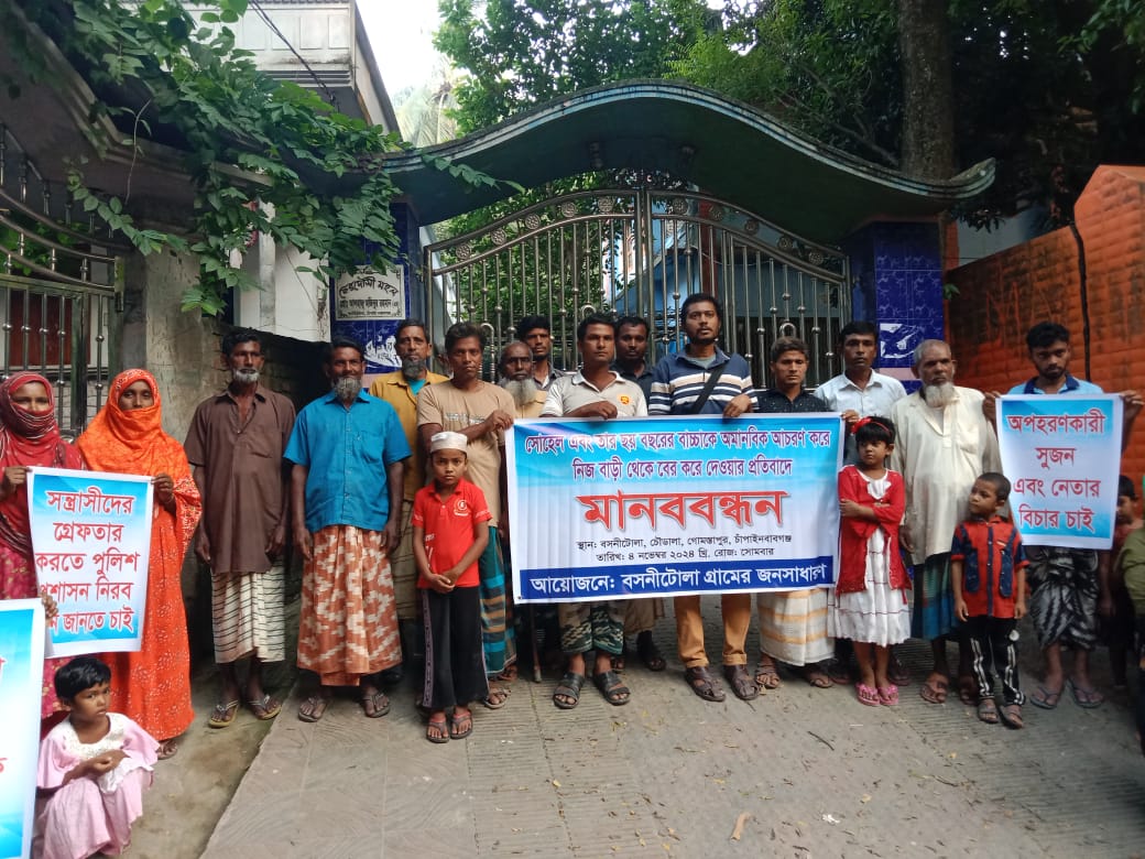 চাঁপাইনবাবগঞ্জের গোমস্তাপুরে বড়ভাইয়ের রোষানলে পড়ে ৬ বছরের শিশুকন্যাসহ ঘরছাড়া হয়েছেন এক পিতা। এ ঘটনার প্রতিবাদে গত সোমবার বিকেলে মানববন্ধন করেছে এলাকাবাসী। ঘটনাটি ঘটেছে গত বৃহস্পতিবার উপজেলার চৌডালা ইউনিয়নের বসনিটোলা গ্রামে। ঘটনার শিকার ওই গ্রামের মজিবুর রহমানের ছেলে সোহেল জানায়, গত বৃহস্পতিবার বড়ভাই সুজনের করা মামলায় আদালতে হাজিরা দিতে চাঁপাইনবাবগঞ্জে অবস্থান করার সময় তার বড়ভাই সুজন তার ছয় বছর বয়সী শিশু কন্যা সামিয়াকে বাড়ি থেকে বের করে দিয়ে বাড়ি তালাবদ্ধ করে রাজশাহী চলে যায়। সেদিন থেকে সে শিশু কন্যাকে নিয়ে প্রতিবেশীদের বাড়িতে অবস্থান করছেন। এ ঘটনায় সে গোমস্তাপুর থানায় একটি অভিযোগ করেছেন বলে জানান। এরআগেও তার বড়ভাই তাকে মাদকাসক্ত তকমা দিয়ে পিতৃ সম্পত্তি থেকে বঞ্চিত করতে শিশুকন্যাসহ অপহরণ করে। এ সংক্রান্ত একটি মামলা আদালতে বিচারাধীন রয়েছে বলে তিনি জানান।ছোট ভাইয়ের অভিযোগ প্রসঙ্গে বড়ভাই সুজন জানায়,ছোটভাই সোহেলের অভিযোগ অস্বীকার করে তিনি জানান, সে মাদকাসক্ত ও মানসিক রোগী। তাকে সংশোধন করতেই আমাদের এ উদ্যোগ।