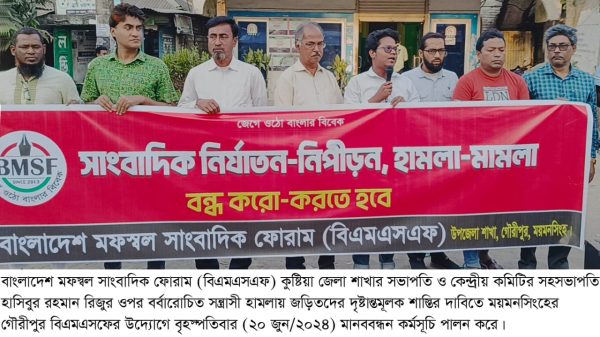 কুষ্টিয়ার সাংবাদিক নেতা রিজু ওপর বর্বারোচিত হামলার প্রতিবাদে গৌরীপুরে মানববন্ধন ও বিক্ষোভ