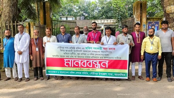গৌরীপুর সাব-রেজিস্ট্রি অফিসের সহকারী স্বপ্না বসাকের দুর্নীতি, ঘুষ বাণিজ্য ও দলিল লেখকদের সাথে অশালীন আচরণ করার প্রতিবাদে মানবববন্ধন