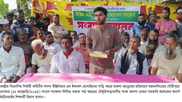 হামলা-ভাংচুরের দায় নেয়নি গ্রামবাসী ॥ বিএনপি’র কেন্দ্রীয় নির্বাহী কমিটির সদস্যের গাড়ি বহরে হামলা-ভাঙচুরের প্রতিবাদে গৌরীপুরে গ্রামবাসীর সংবাদ সম্মেলন