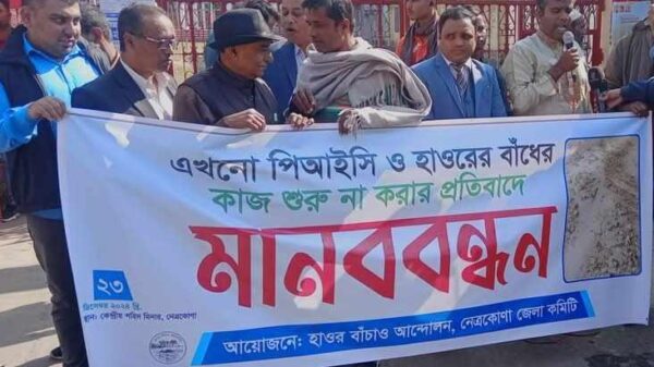 নেত্রকোণায় পিআইসি ও ফসল রক্ষা বাঁধ নির্মাণ শুরু না করার প্রতিবাদে মানববন্ধন