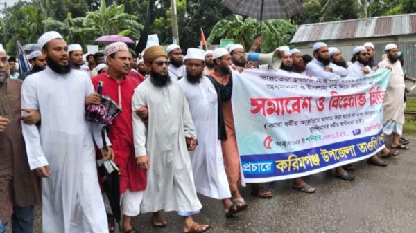 করিমগঞ্জে বিশ্বনবীকে কটুক্তির প্রতিবাদে বিক্ষোভ মিছিল ও মানববন্ধন।
