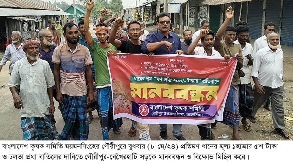গৌরীপুরে প্রতিমণ ধান ১৫শ টাকা ও ঢলতাপ্রথা বাতিলের দাবিতে বিক্ষোভ ও মানববন্ধন
