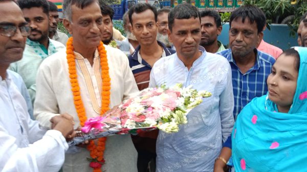 গোমস্তাপুরে নব নির্বাচিত চেয়ারম্যান আশরাফ হোসেন কে ফুলের তোড়া দিয়ে বরণ নেতাকর্মীরা